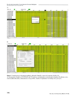 A), alineamiento obtenido en CLUSTALW con 599 caracteres no informativos excluidos para el análisis; B) edición a selec-