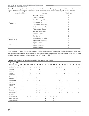 Tabla 2. Lista de especies capturadas y número de individuos capturados agrupados según la dieta predominante de cada